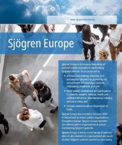Sjögren Europe is a European federation of national associations representing Sjögren’s patients. Its purpose is to get more visibility, attention and solutions for Sjögren’s by promoting the advancement of knowledge, research, information, treatment and care, by fostering patient involvement and participation in the scientific research, medical, health and political institutions, pharmaceutical industry and social areas, and by increasing awareness about Sjögren’s at all levels.